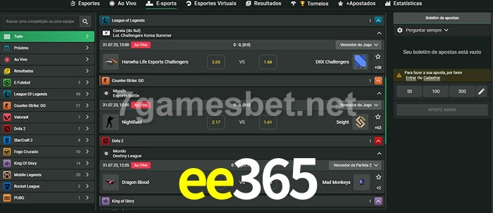 O ee365 oferece uma grande seleção de opções de apostas em e-sports com probabilidades competitivas